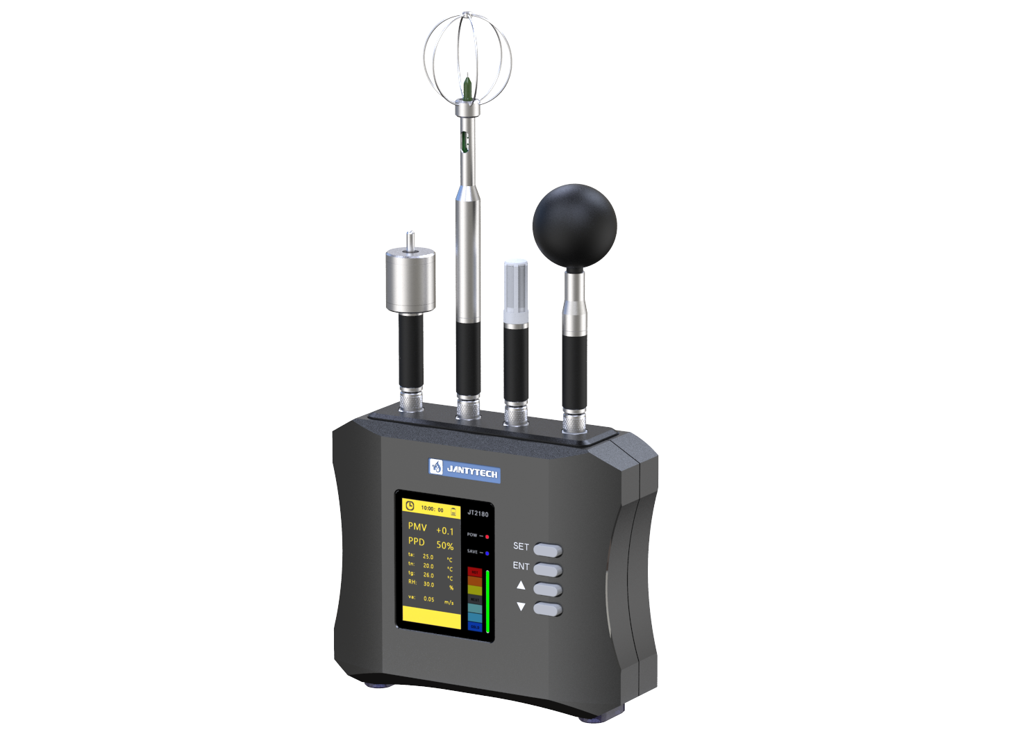 • JT2180是一款便攜式環(huán)境熱舒適度測試儀,集成溫度、濕度、風速、黑球溫度、濕球溫度等傳感器,符合ISO7730的PMV、PPD指標算法。同時集成了PM2.5、CO2傳感器,作為室內空氣質量測試的重要參考指標。